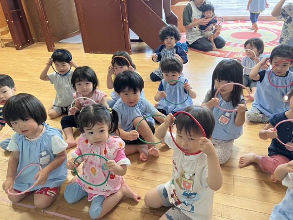 まずは、ピアノ伴奏と歌に合わせて輪っかを使って「♪ま~るい窓から お顔が ばあっ😄」