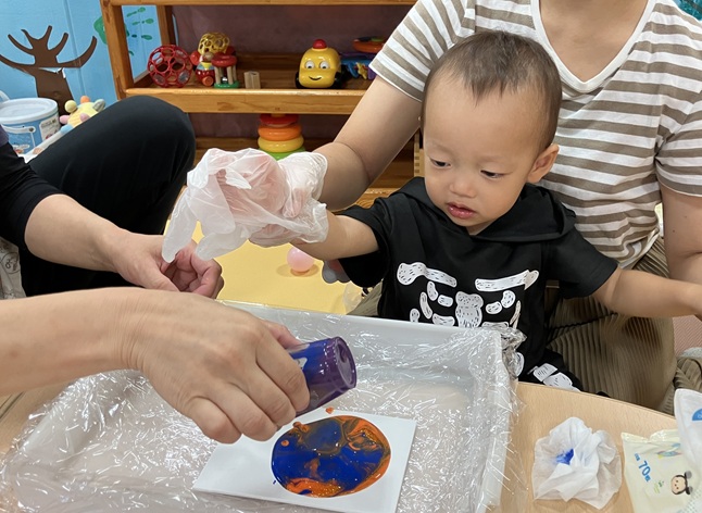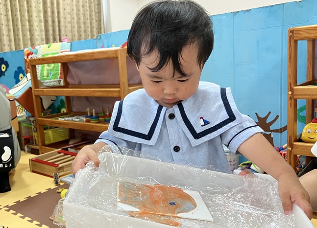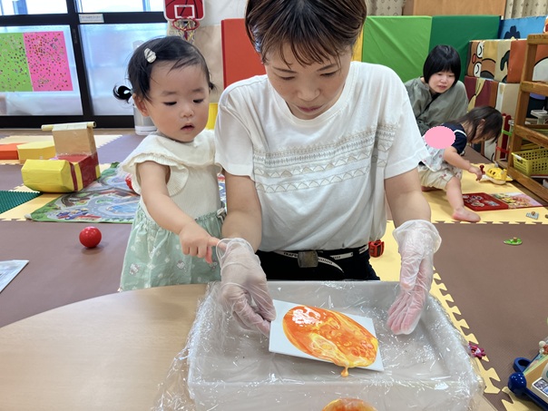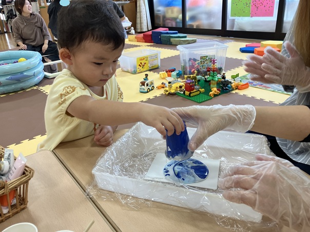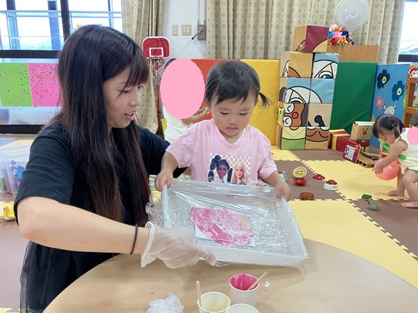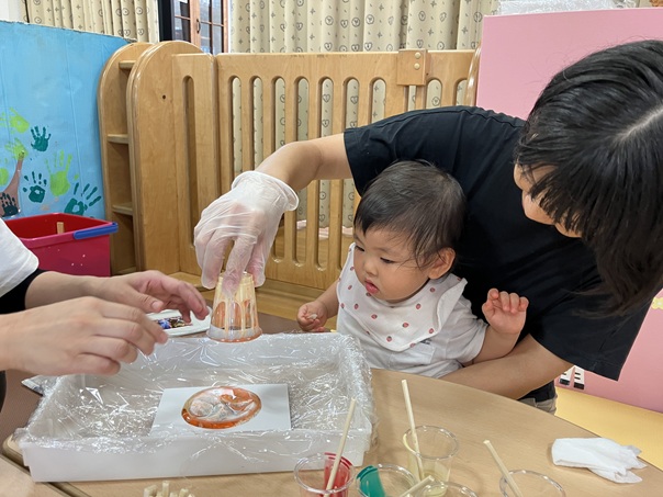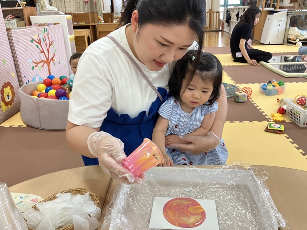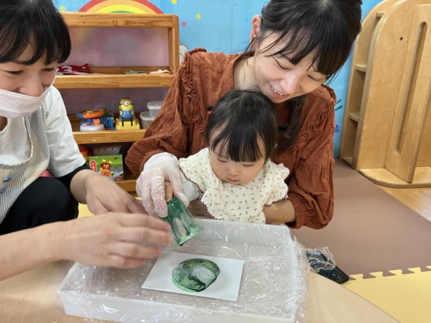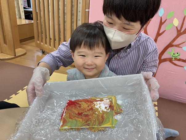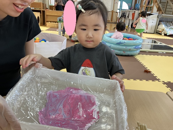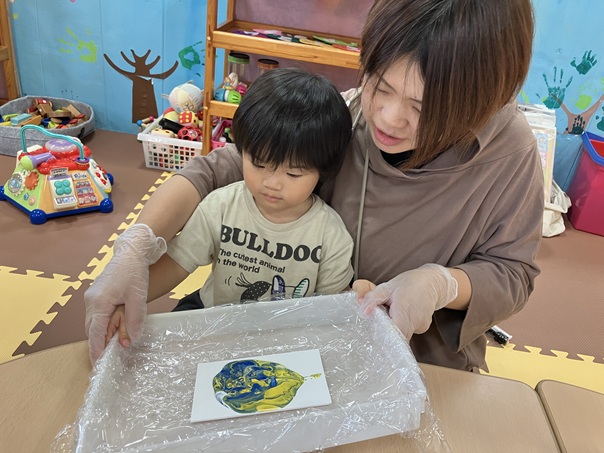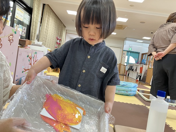 4色の絵の具が混ざりあった綺麗な色に驚きつつ、嬉しそうなお子様たちでした🥰
