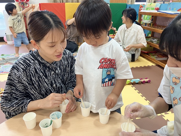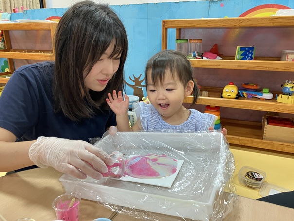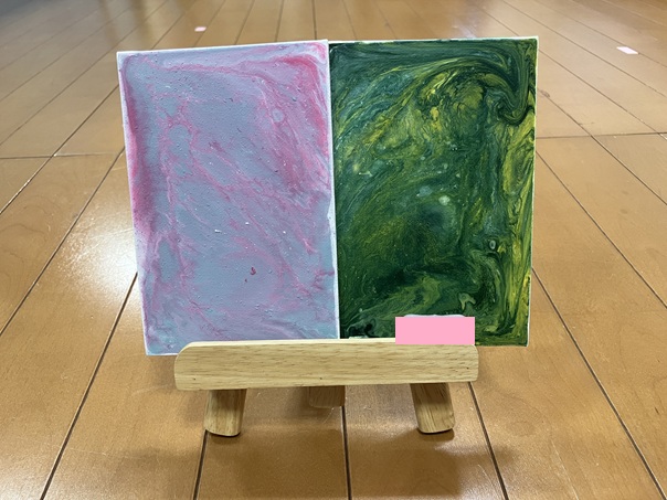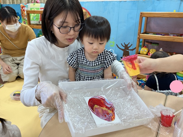 お子様たちにたくさんある色の中から好きな色を4色選んでいただき、絵の具の流れや模様などを見て楽しんでいただきました✨✨