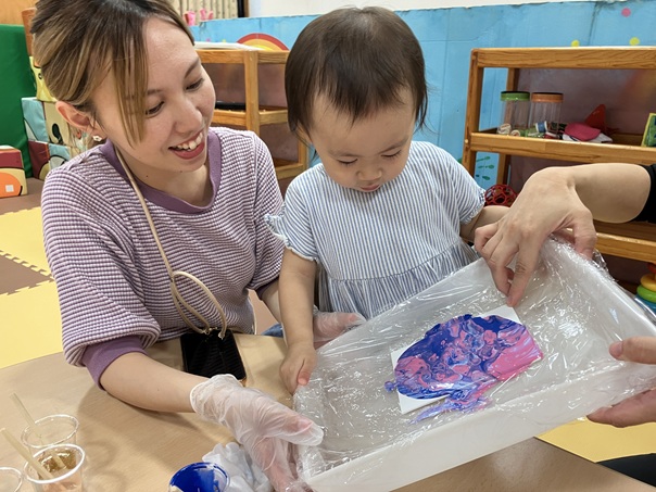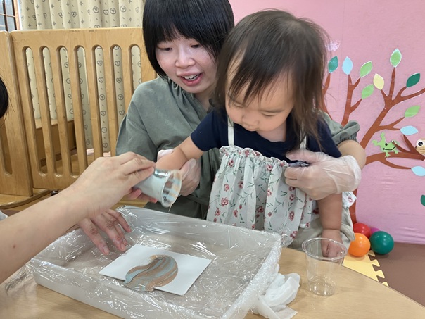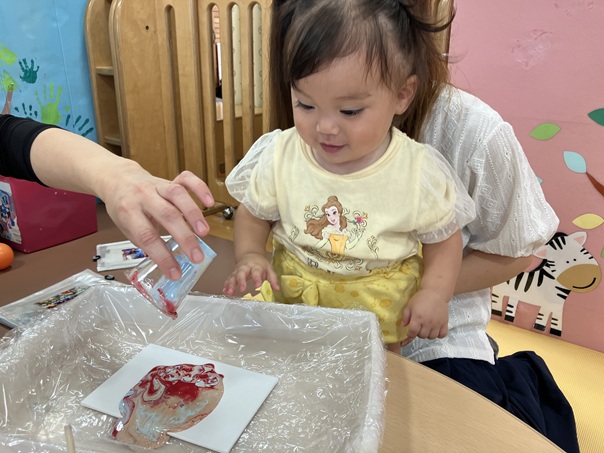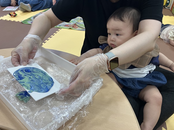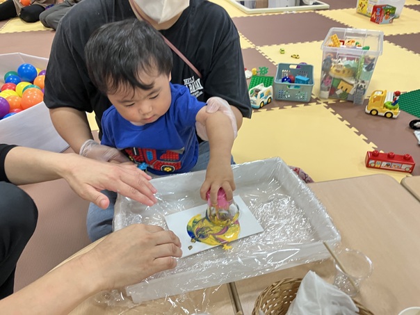 お子様たちにもトレーを持ってもらい、キャンバス上での絵の具の流れを楽しんでいただきました🤗