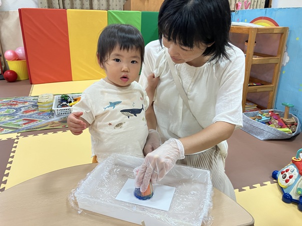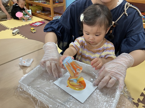 プラカップを外した瞬間に流れ出る絵の具に興味津々です🤗