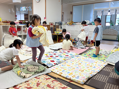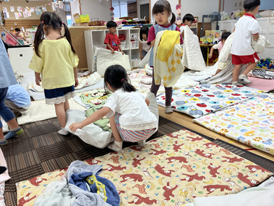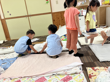 お布団を敷き終えると、タオルケットを見て、「綺麗にしないと。」と言いながら整えていました。いつも保育士が整えている様子を見て、きれいな状態が気持ち良いことに気づいている子ども達です。
