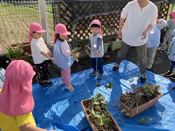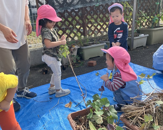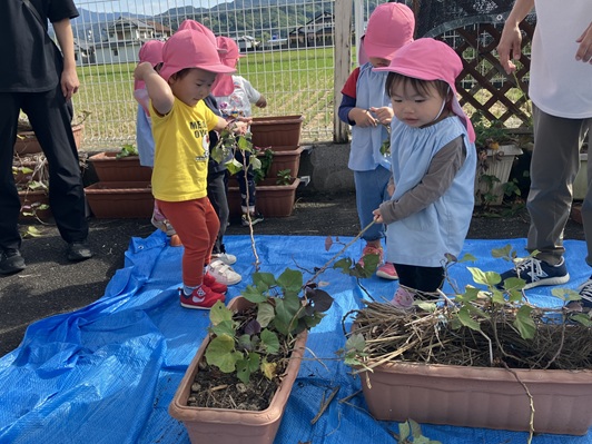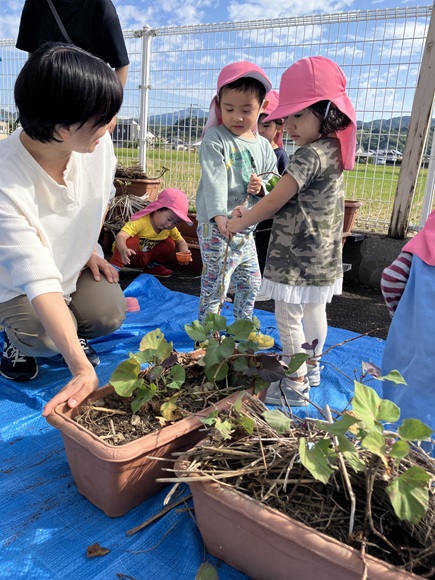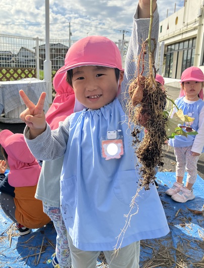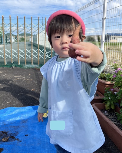 沢山のさつまいもが抜けました。「おっきいね」「ちっちゃいね」「ほそいね」など、見たこと感じたことを保育士や友達と話し盛り上がりました😊「食欲の秋」、いろいろな食材に興味をもってもらいたいと思います。