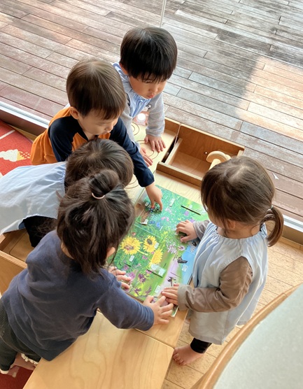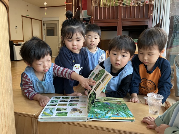 朝「ウッドデッキにいた虫は何?」と尋ねてきたので、図鑑を渡しました。ページをめくりながら指差し、「これかな?」「これだよ」と子ども達で話していました。子ども達の「なんだろう?」には、「どんなことを発見するかな?」「どんな会話が繰り広げられるかな?」と保育士もワクワクします🤩