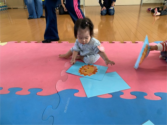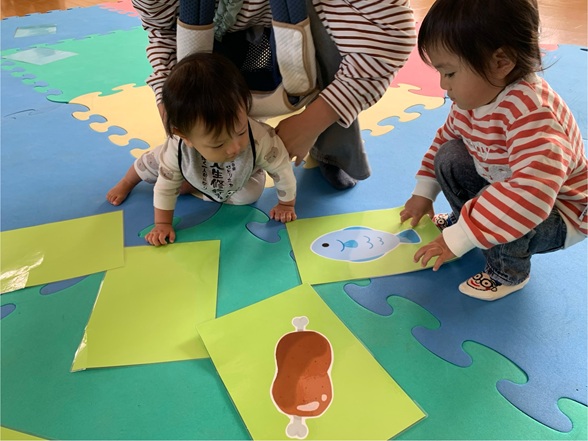 お母様と一緒にどうぶつのまねっこをしながら、好きな食べ物が描いてあるカードを探していただきました☺️
