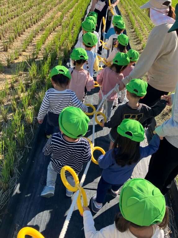 お友達と一緒に「さんぽ」の歌を歌いながら、皆で誘導ロープを握ってあぜ道を歩きました🎶