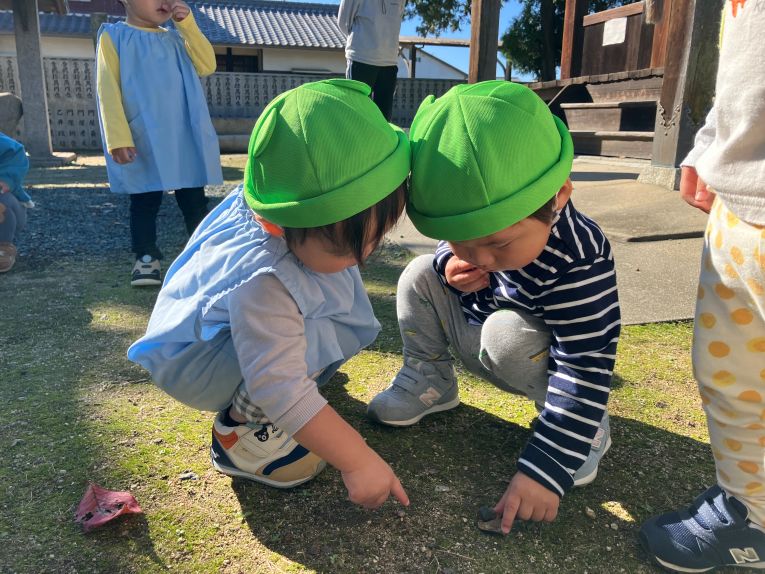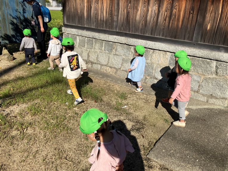 神社に到着すると、保育士の後に続いて神社の周りを歩き、探索をしました。
