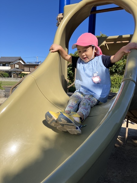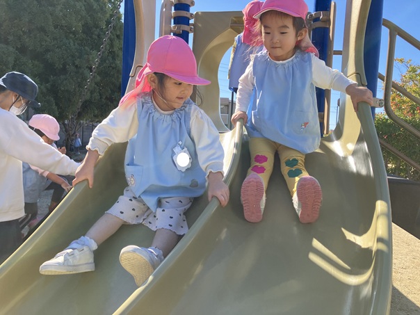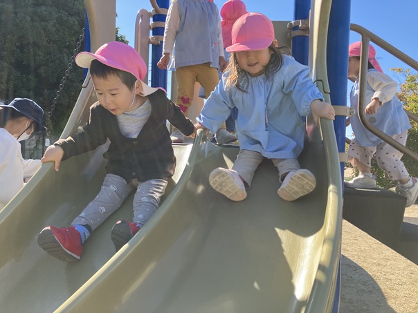 お友達と手を繋ぎ、馬木公園まで歩きました。公園では、すべり台や鎖登りをして元気いっぱい体を動かして遊んでいました。