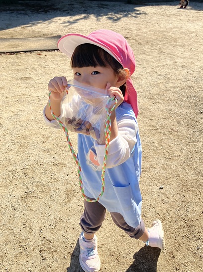 そして、木の実が落ちていることに気付くと、木の実探しが始まりました。「どんぐりだ」「こっちにもあった」「あっちにも行ってみよう」とお友達を誘う姿も見られました。たくさん見つけることができ、嬉しそうに見せてくれました😊