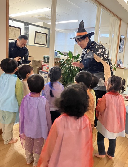 いよいよ、もも組さんと園長先生のところへ・・・「トリックオアトリート お菓子をくれなきゃいたずらするぞー!」。お菓子を持っていなかった先生たちには、シールを貼っていたずらをしちゃいました😝