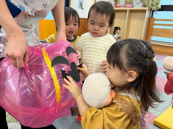誕生会の後に、ハロウィンのカボチャに顔をつけるお手伝いをしてくれました。