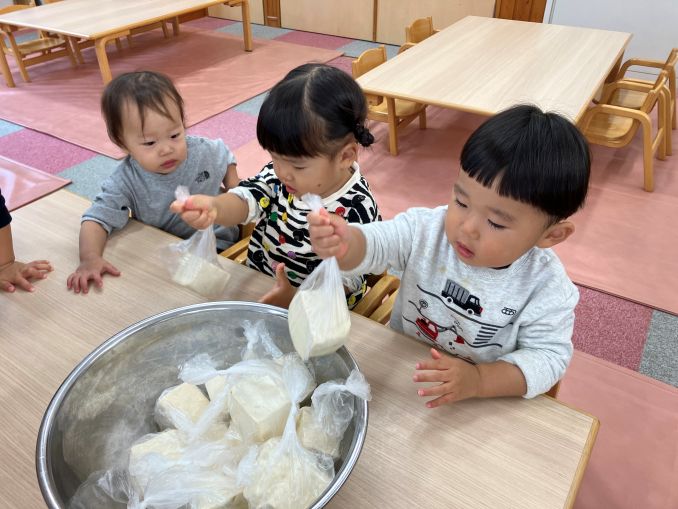豆腐の感触を楽しみながらつぶしていました。