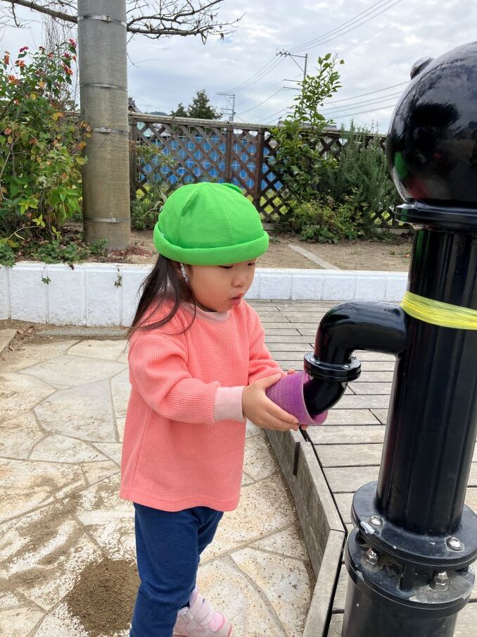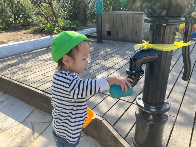 砂場横のポンプの口のコップを持っていき水を入れる真似をしていました。