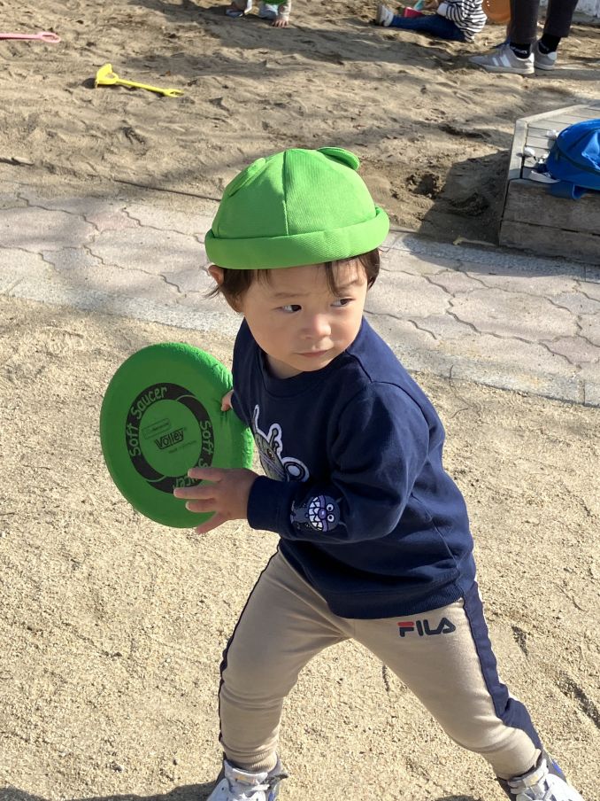 以上児さんがしている姿を見て、フリスビーに挑戦。