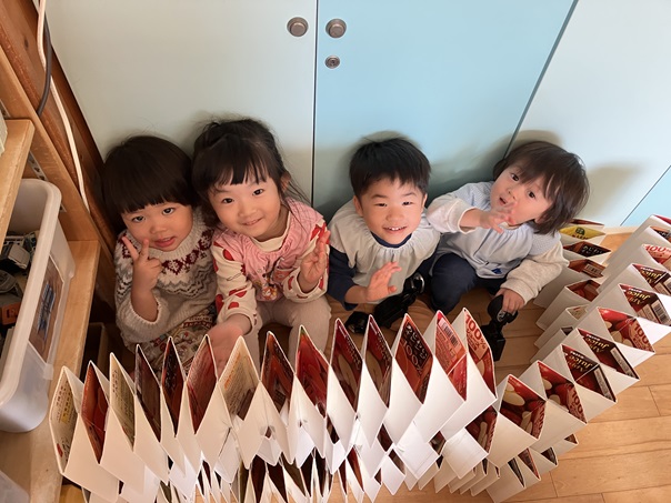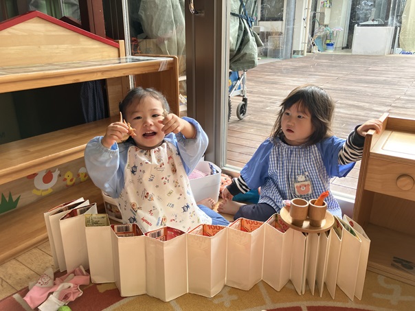 たんぽぽ組さんにはジュースの紙パックで作ったジャバラ状の仕切りがあります。自分だけのお家を作ったり、お友達と一緒にお家を作ったりしていて、大人気の玩具となりました。
