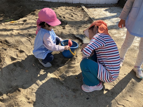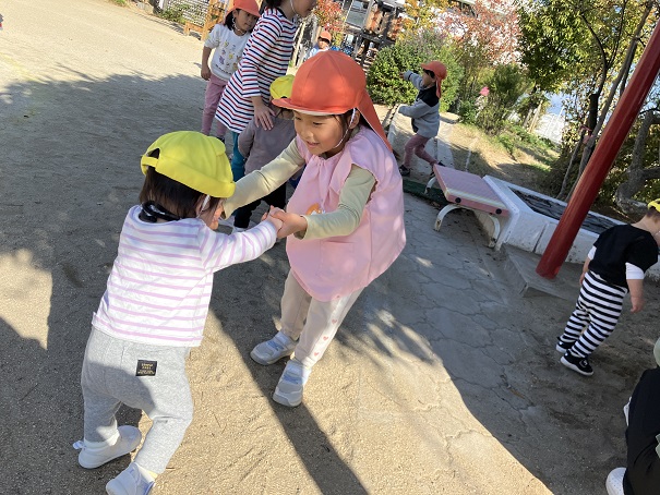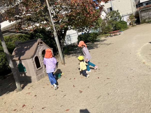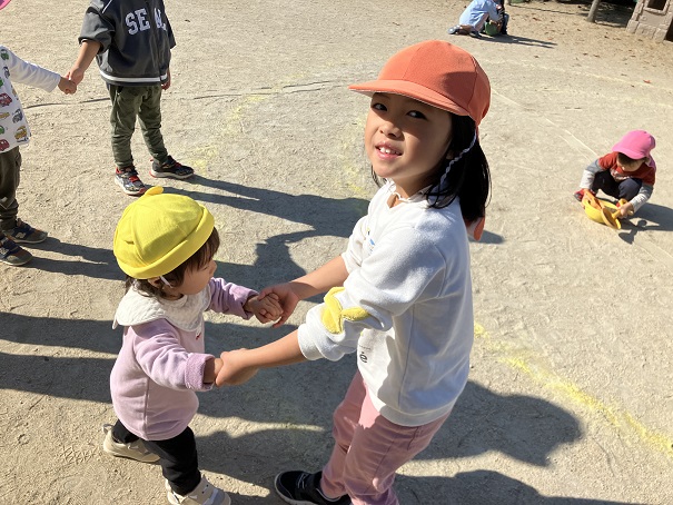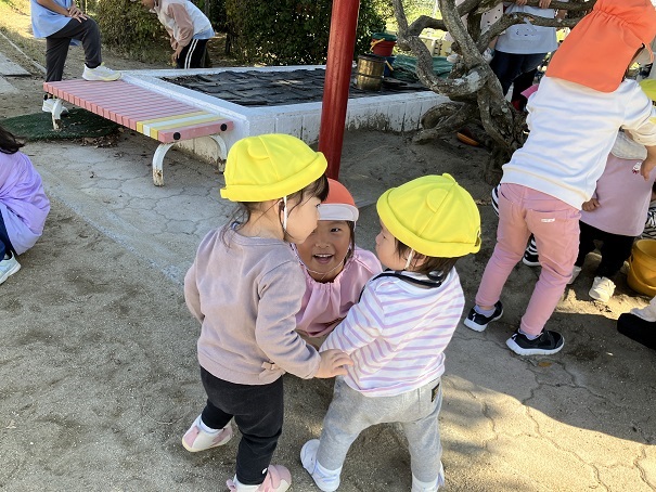 外で遊んでいると、もも組とたんぽぽ組の子どもたちも遊びに来ました。