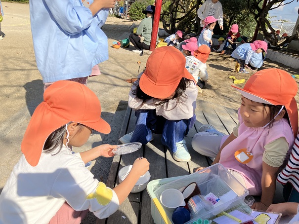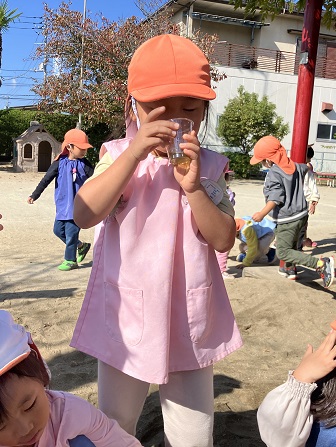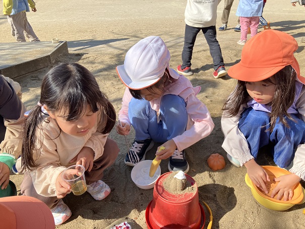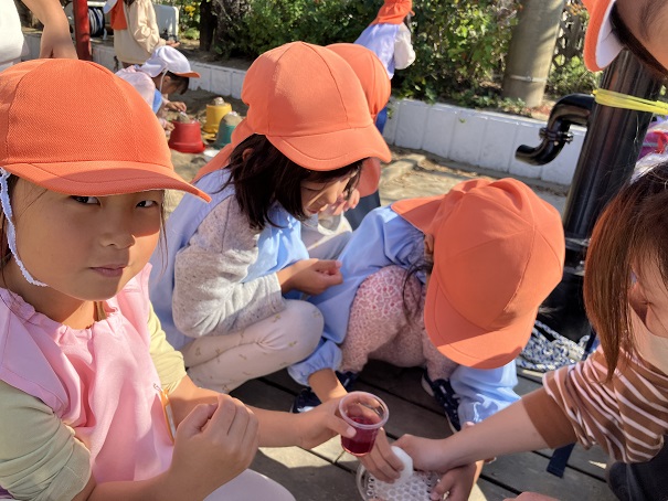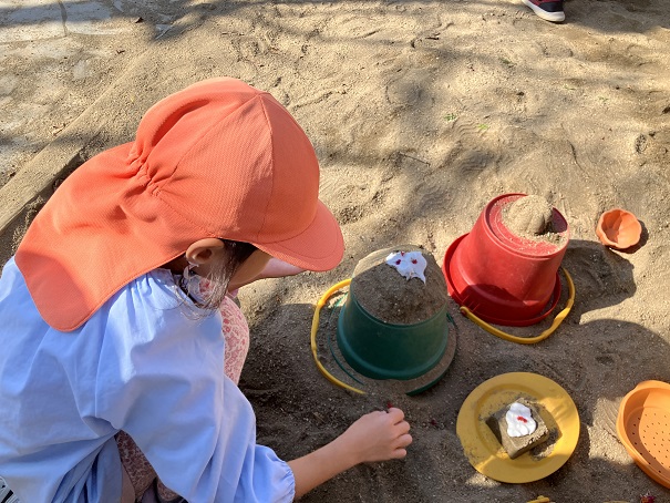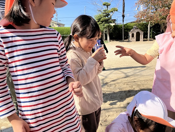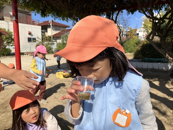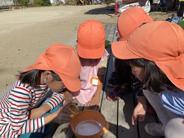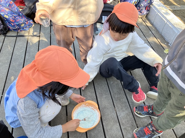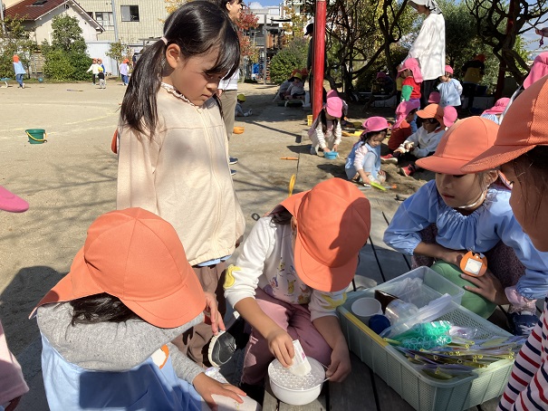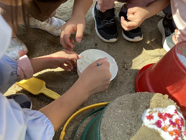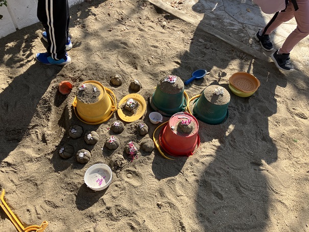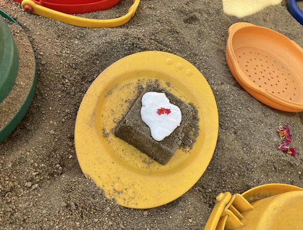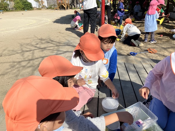 この2つだけで、削り器を使う、泡だて器を使う、砂場で型抜きをする、色水ができる花を探すなどなど・・・の経験・遊びとなりました。