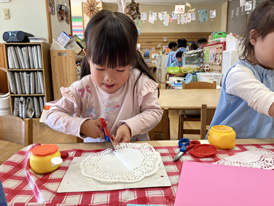 お部屋では、クリスマスブーツ作りに取り組んでいます。サンタクロースに会えるのを楽しみにしている子ども達です。