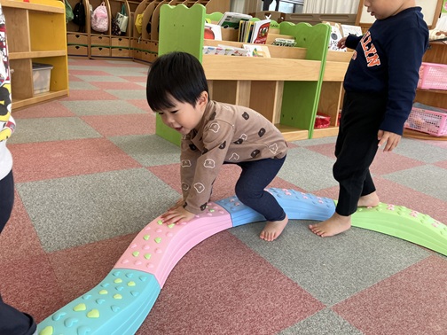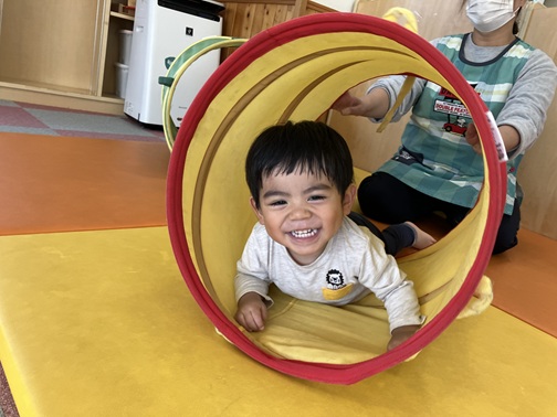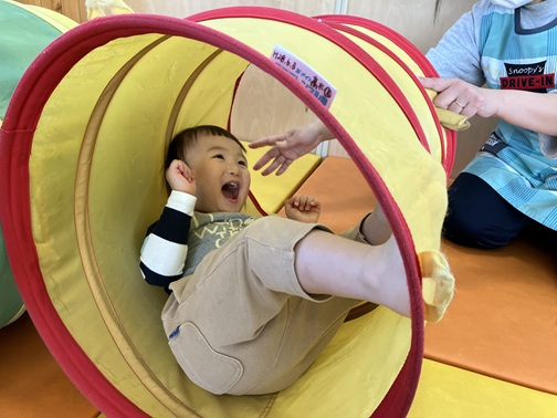 平均台の他にもマットやトンネルを出しました。トンネルの中に入っていたので「コロコロ~」と少し揺らしてみると、、、