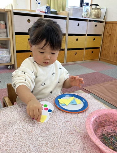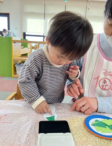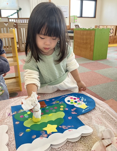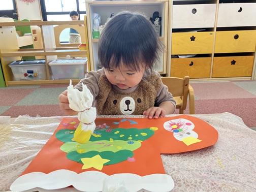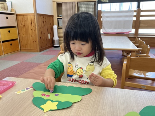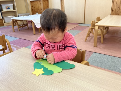 クリスマスツリーにシールを貼りました。指先も器用になり、全員自分で台紙からシールを剥がすことができます。自分の好きな所に貼り、「まだ貼りたい!」「シールちょうだい!」と保育士に手のひらを差し出す子も多くいました。