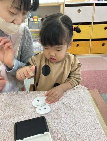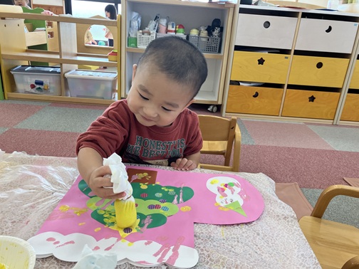 タンポを使って絵の具をスタンプしました。「きいろー」「ピンクー」など好きな色を選び、力強く押す子、チョンチョンと優しく押す子。押し方は様々でした🌟