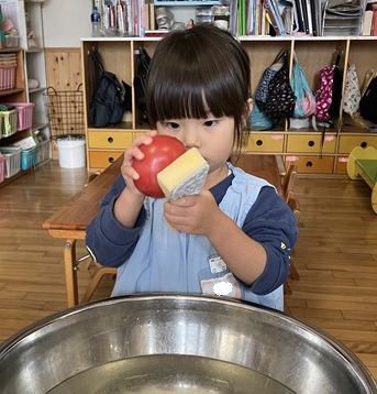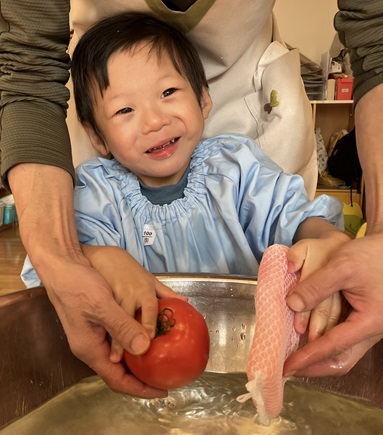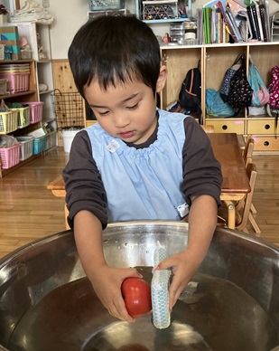 お友達が洗っているのを見ながら、待っている間「ドキドキするね。」と言う声が聞こえてきました。少し緊張気味のお友達もいましたが、みんな優しくトマトを持ち、スポンジでそっと洗っていました。