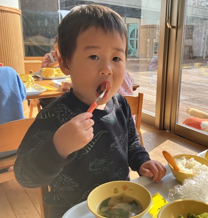 給食の時間になると、みんなが洗ったトマトは美味しそうなサラダになって出てきました。「サラダに入ってるトマトは、みんなが洗ってくれたトマトだよ。」と伝えると、嬉しそうに食べていました。これからも給食室のお手伝いをしながら、いろいろな食材に触れていきたいと思います。