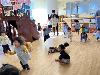 次は、「だるまさんが、ジャンプした!」「だるまさんが、座った!」など次の行動を変えてみると…