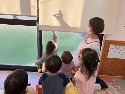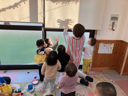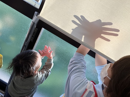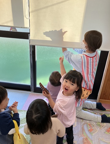夕方、西日が差し込むのでロールカーテンを下ろしています。そこで保育士が「きつね」や「いぬ」を手で作ると大喜び✨ 「おった!」と指を差したり、ロールカーテンの後ろを覗いたり。中には真似をする子もいました😊