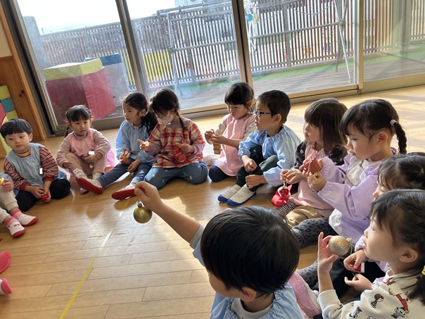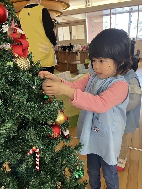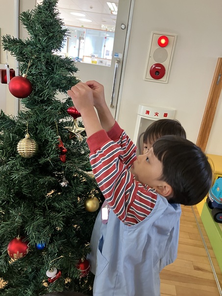 クリスマスに向けて園内もクリスマスムードが高まっています。先日、ちゅうりっぷ組さんも玄関のクリスマスツリーの飾り付けを行いました。