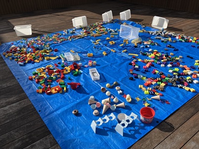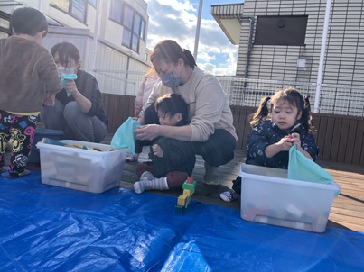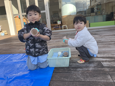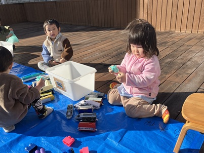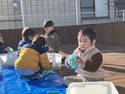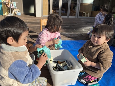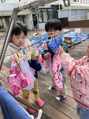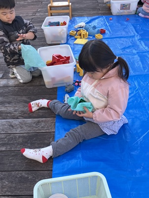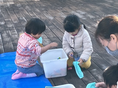 玩具をウッドデッキに持って行き“自分の好きな玩具から拭いていいよ~😊”と伝えると、「アイス(の玩具)にする✋」「きょりゅうにする✋」「アイクリップにする✋」など、自分のお気に入り🥰の玩具をお湯で温めた布で早速拭いていました。