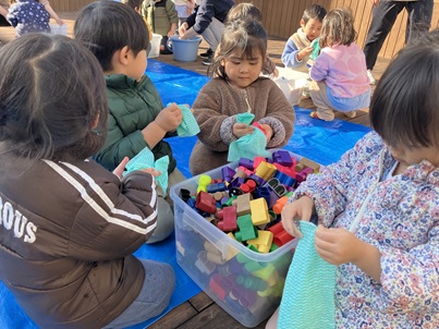 「みて~👀ピッカピカ✨」と自分が拭いた玩具を、保育士や友達に得意気に見せていました。初めに拭きだした玩具が終わると、まだたくさん残っている玩具の所に移動して、お手伝いをしてくれました✋