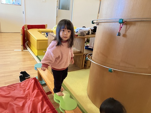 トトロの森にある平均台。保育士の手を握ったり壁を支えにしたりしながら渡ることを楽しむ子も多いですが、1人で渡ることができる子もいます。最初は怖がっていても友達がしている姿を見て「自分も!」とやる気になった子もいました✨