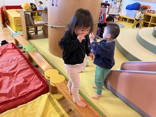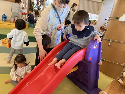 滑り台は人気なので階段の所が混雑します。保育士が「待ってね」と伝えると、「じゅんばん?」と言いながら友達が滑り終えるのを待ったり、繰り返し楽しんでいくうちに保育士が声を掛けなくても順番を待ったりしていました。