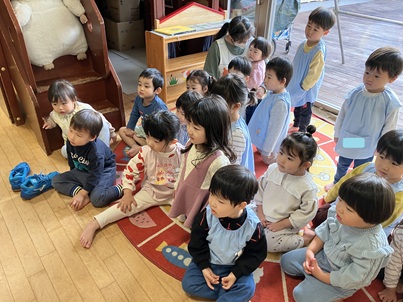 12月上旬に保育士にスケッチブックシアターで歯磨きの大切さをおしえてもらいました。