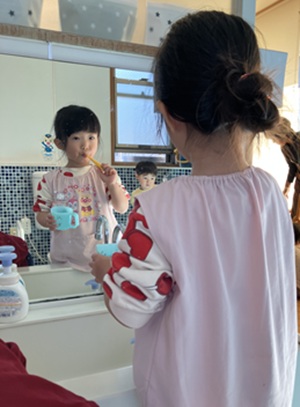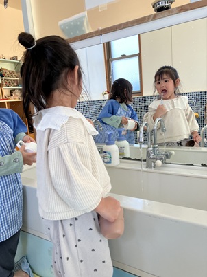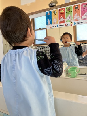 歯磨きを始めた時には、くわえているだけの子や全体を磨けていない子もいましたが、毎日繰り返す中で、自分で鏡を見ながら👀上手に磨くことができるようになってきました。