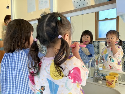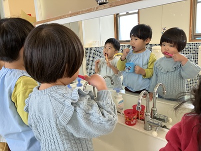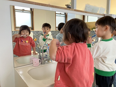 みんなと一緒に磨くと歯磨きが楽しい時間に🎵 お家では、家族と一緒に磨いているかな?これからもおいしいもの😋を食べ後は、上手に磨いて歯をピッカピカ✨にしていこうね。