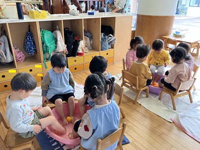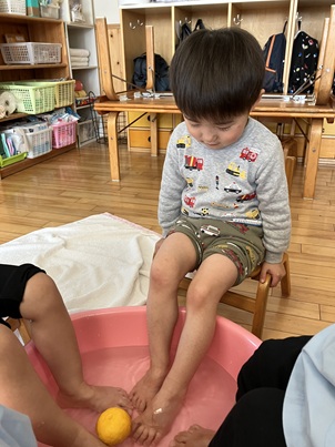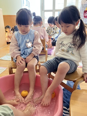 さすがに、保育園で、お風呂…はできないので、タライにお湯を入れゆずやみかんを浮かべて、足湯をしました。初めて(?)の足湯に「いいにおいがする😚」「あったかい🥰」と楽しむ子ども達でした。