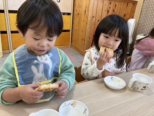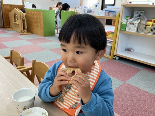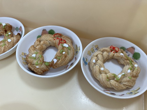 今日のおやつはリースパイ!給食の先生が可愛らしくデコレーションしてくれていました💕お菓子を見ると「なにこれ!?」「うわー!」と、とても良い反応を見せてくれました。