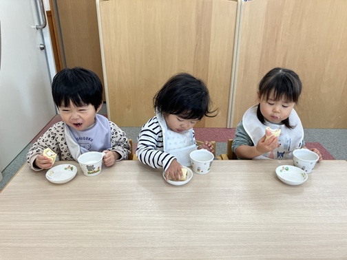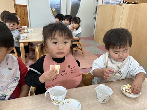 今日のおやつはケーキ🍰登園前から楽しみにしていた子もいたようで、「今日のおやつはケーキだよ!」と、おやつの準備ができて声をかけると「ケーキ!?」「美味しそう!」と目を輝かせていました✨残す子も少なくみんな美味しそうに食べていました😊