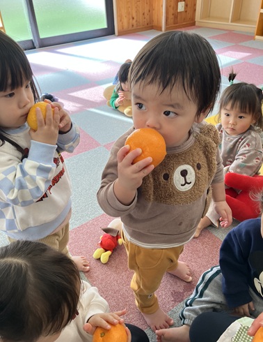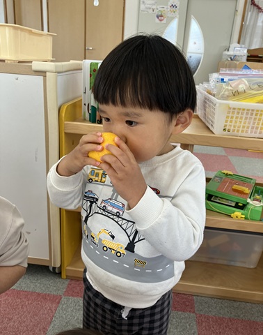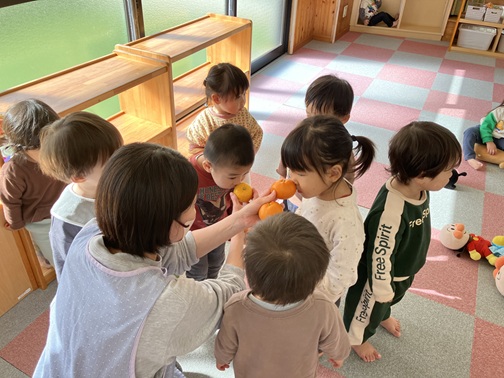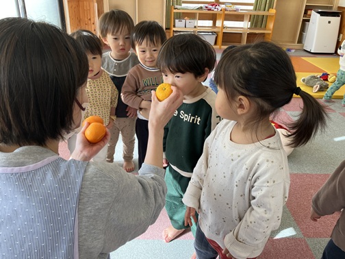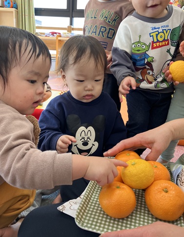 今日は冬至。「冬至って何?」ということで、こすもす組でも冬至について少しお話をしました。みんなにはまだ難しかったかもしれませんが、真剣に話を聞いている子もいました😊そして、柚子やミカンを触ったり匂いを比べたりしました。