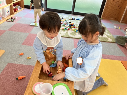 感染症が出ている時には、こうしてお部屋に遊びに来ることも難しいですが、やっぱり年上の友達と関わることは楽しくて、みんなにとっていい刺激になっているようです。これからも異年齢での関わり、大切にしていきたいです😊