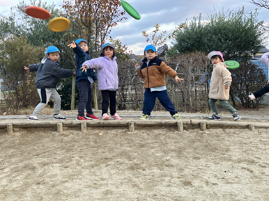 「せーの」と園庭に元気な声を響かせ「○○君が一番飛んだね。」「もう一回。」とフリスビー遊びを楽しんでいる子ども達。