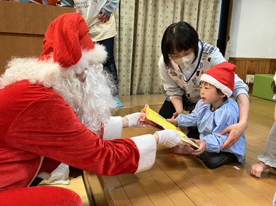 集会では、クラスの代表のお友達がサンタさんからプレゼントをもらいました。