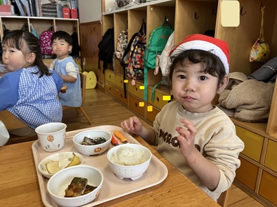 今日は、お部屋にサンタ帽とケープを置き、自分の気に入ったものを身に着けて集会に参加しました。