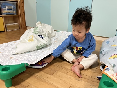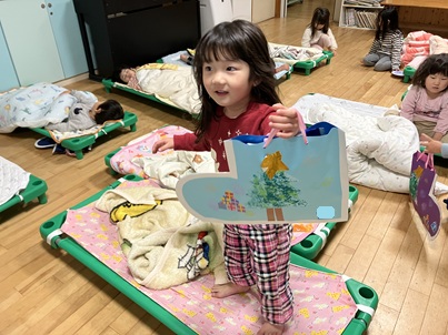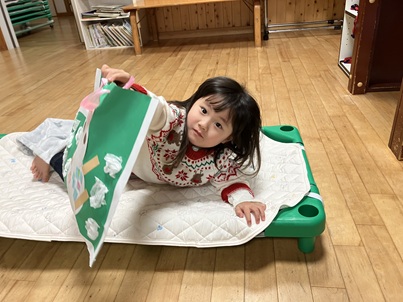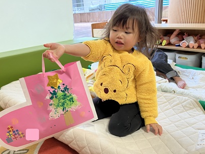 「プレゼントあった~😆」と見つけた子が大喜び🎵 寝ているお友達に「プレゼントがあるよ。」と起こして回り、サンタさんから届いたプレゼントにみんな喜んでいました。