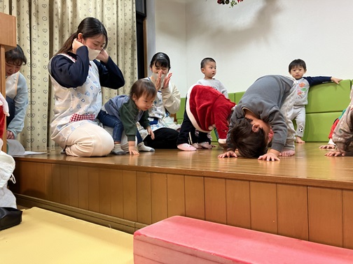 こすもす組のみんなは「できるかな」の曲に合わせて、様々な動物に変身する表現遊びをステージで披露しました。