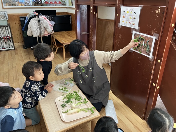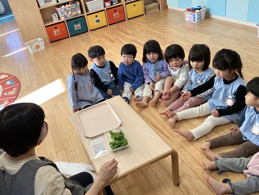 みんな真剣な表情でお話を聞いてくれました。同じ草はどれかな・・・「あっ!あったぁ~。😄」と身を乗り出して見てくれる子もいました。食育活動で、いろいろな食物に興味をもってくれたらいいなと思います😊