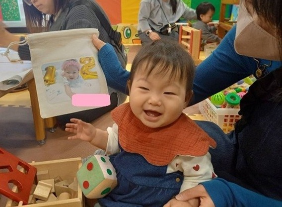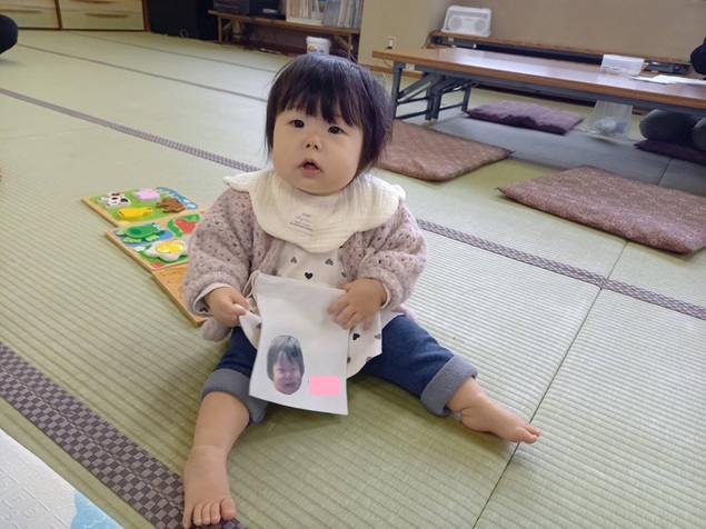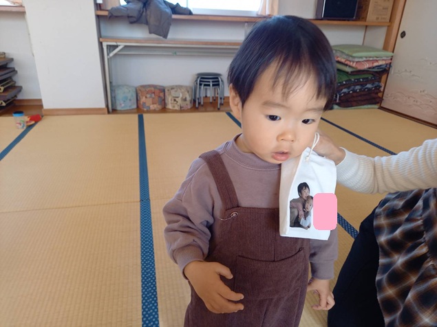 持って来ていただいたお子様の写真やお子様の好きなキャラクターなどを、巾着袋の上に配置していただき、保育士の方で圧着させていただきました😊