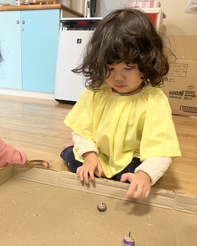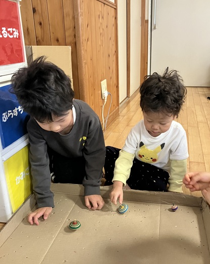 お正月遊びに興味をもち、クラスのお友達がこまを回せるようになると、「ぼくも」「わたしも」と、こま回しに挑戦!遊びに来てくれていたお兄さんと一緒に、真剣な表情でこまを回していました。